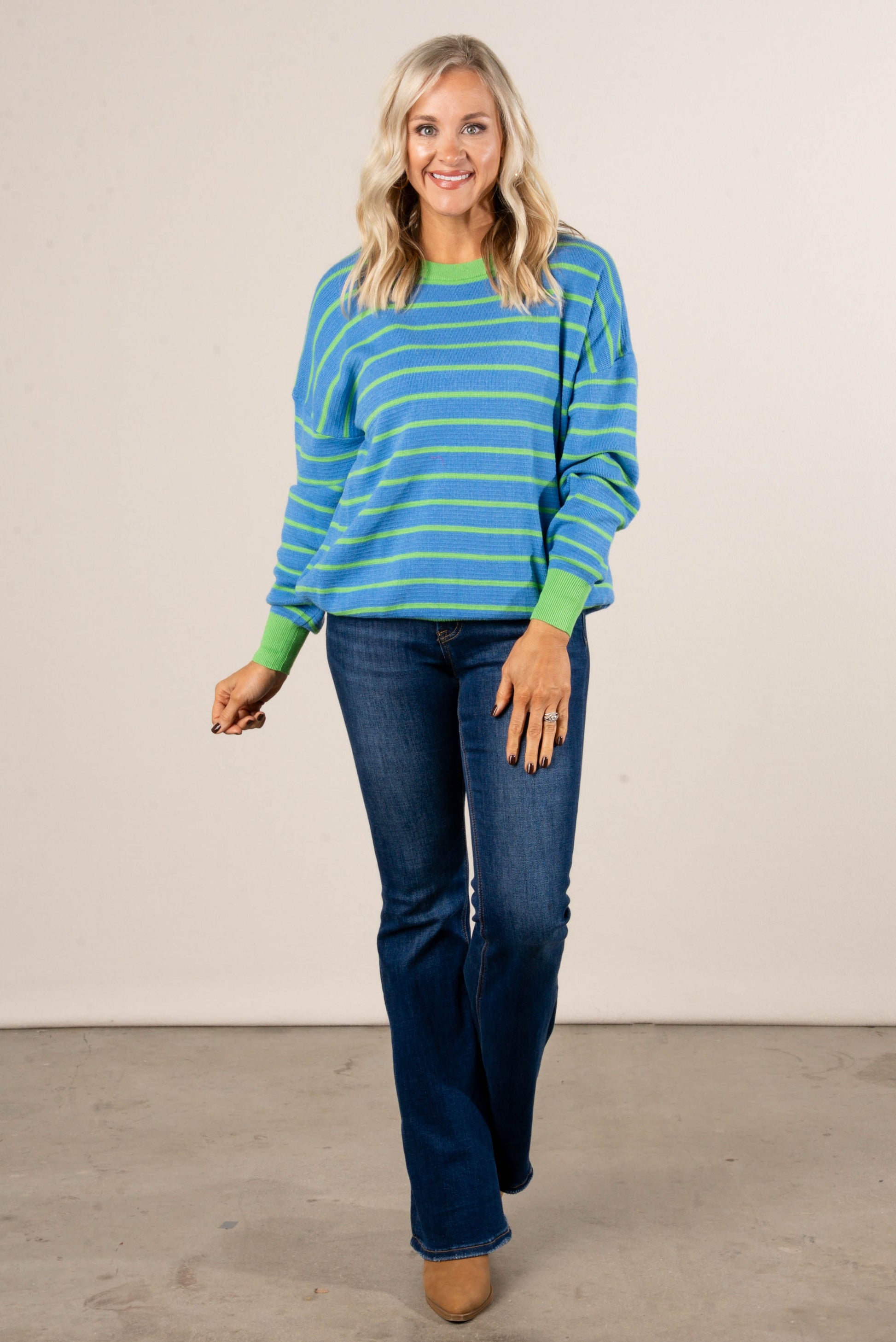 • Design: Features bold horizontal stripes with contrast ribbed neckline, cuffs, and hem for a fun, modern touch