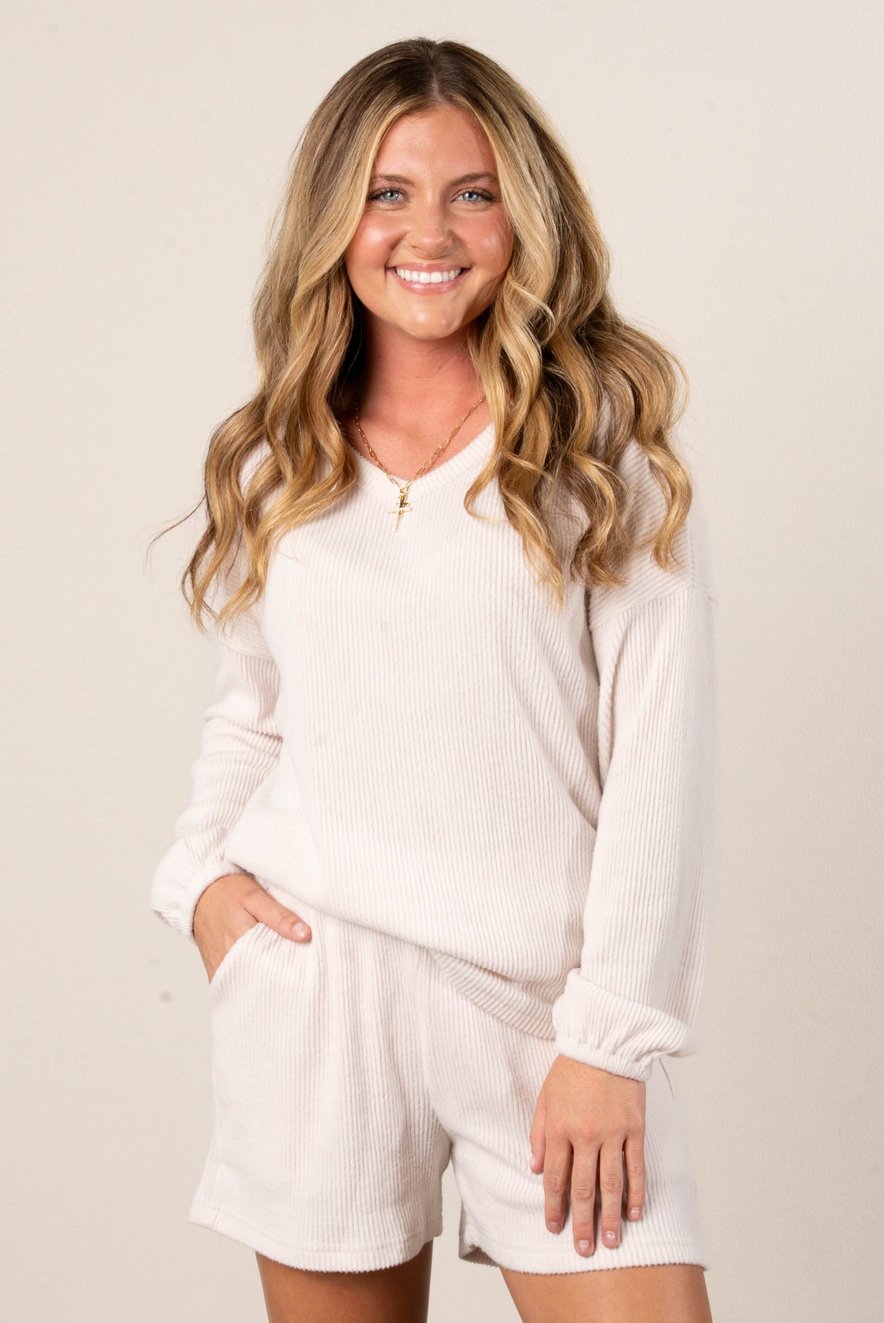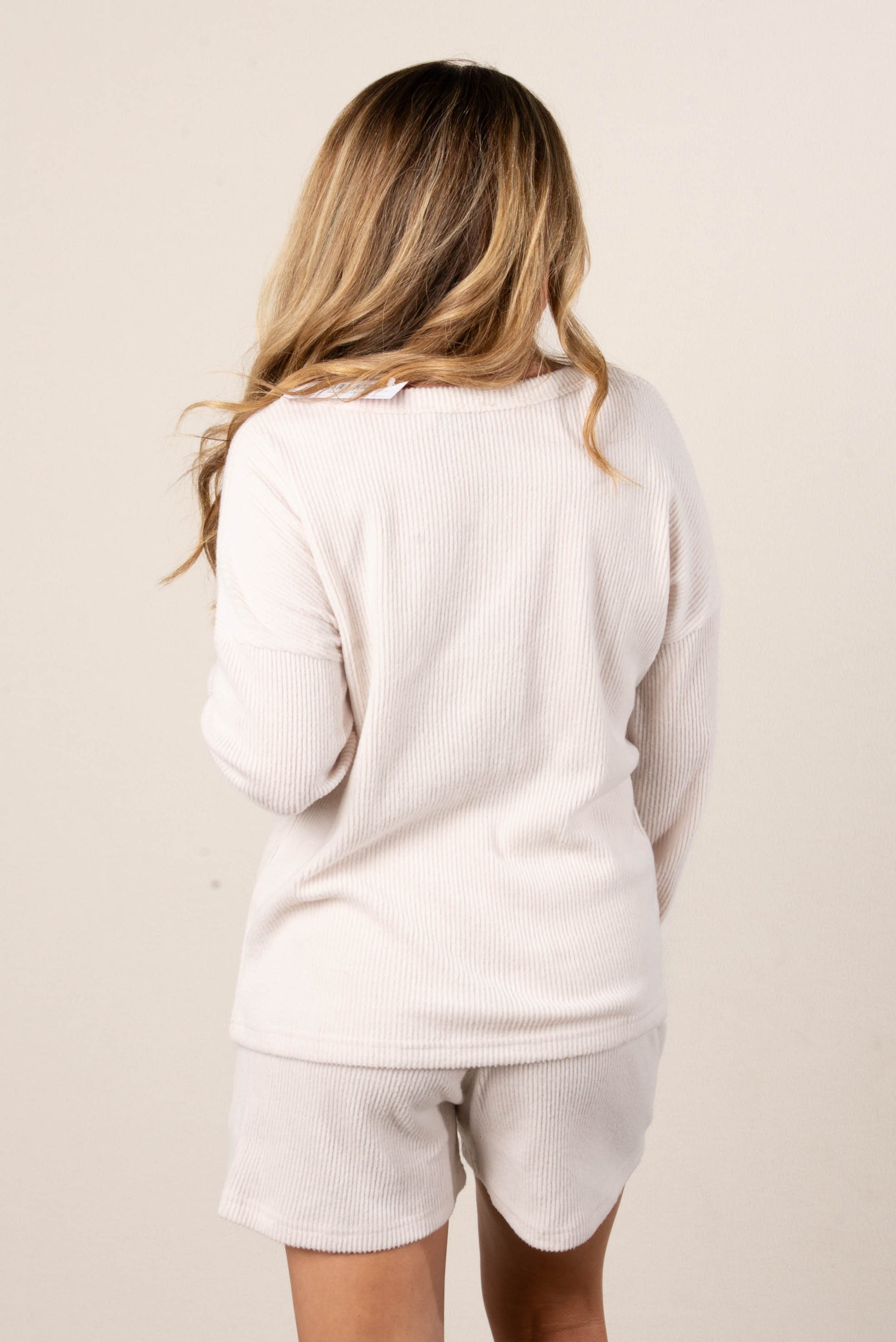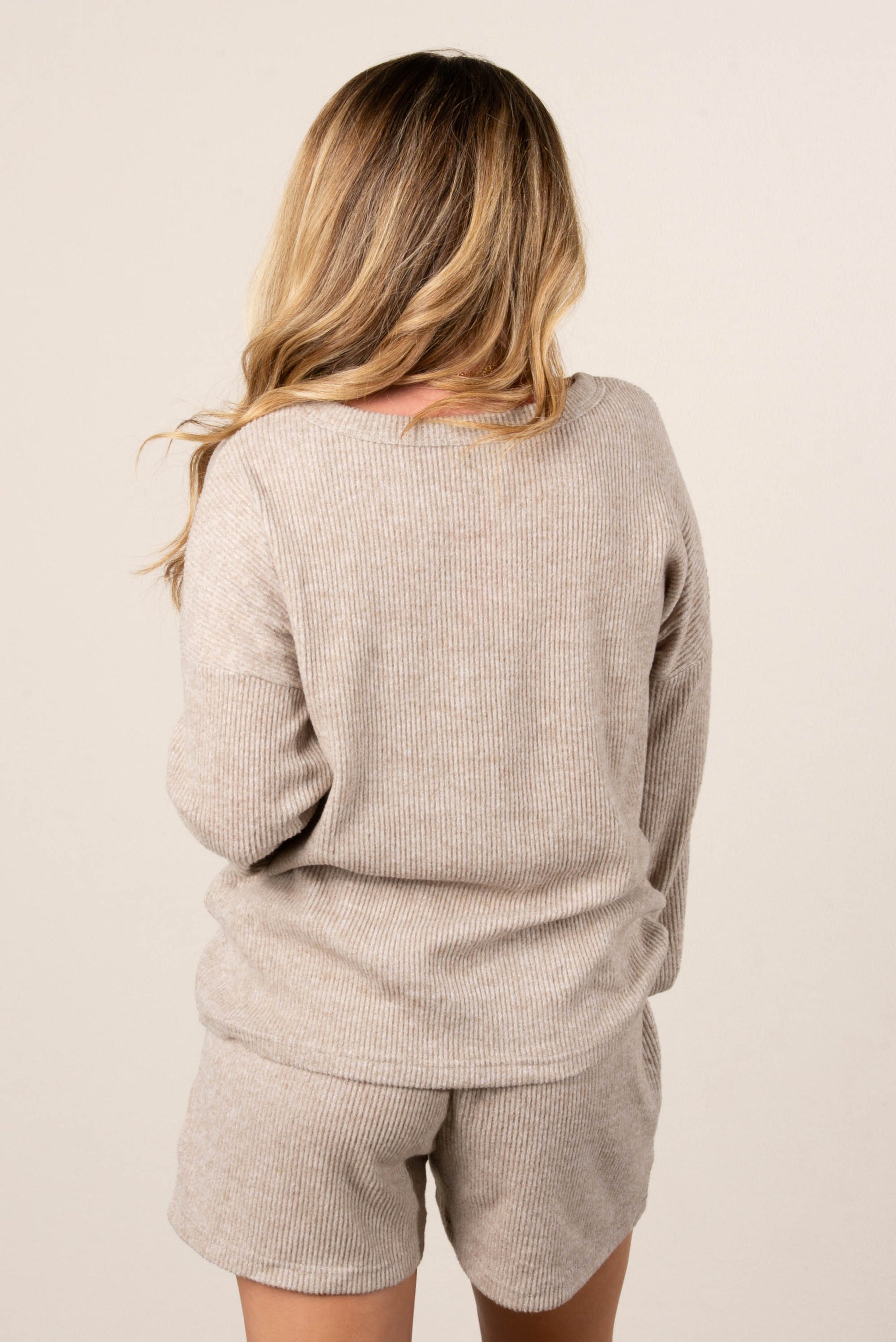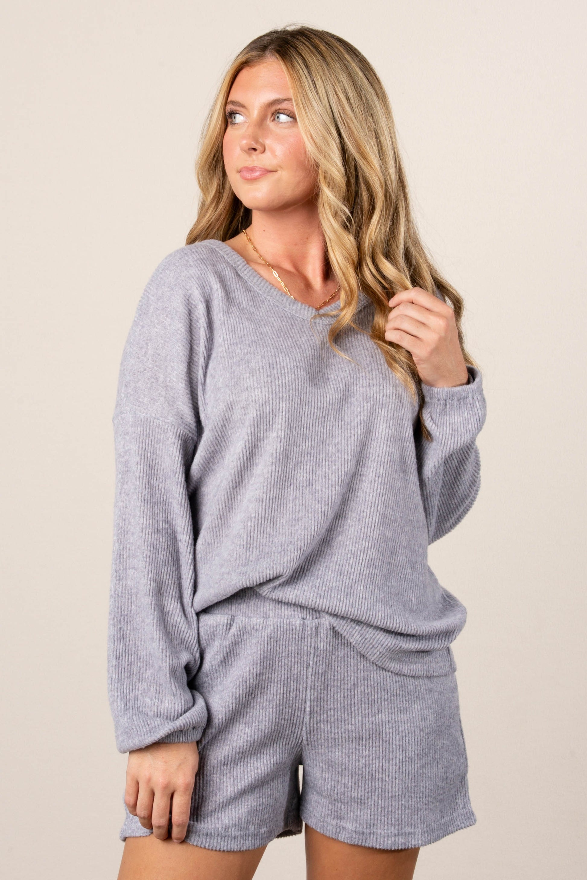 - Style: Women’s two-piece ribbed knit lounge set featuring a long sleeve top and elastic waist shorts
