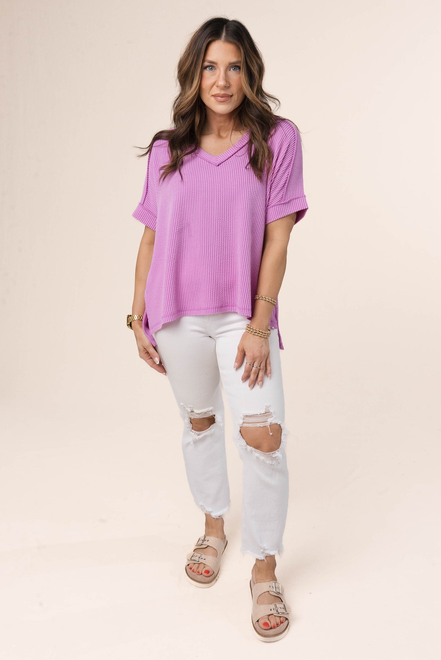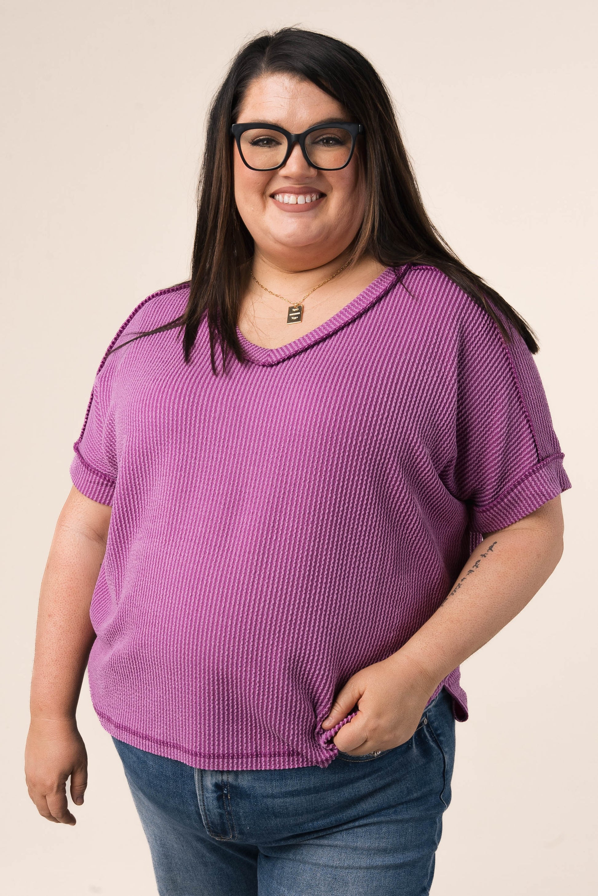 Corded Rib Exposed Seam V-Neck Top