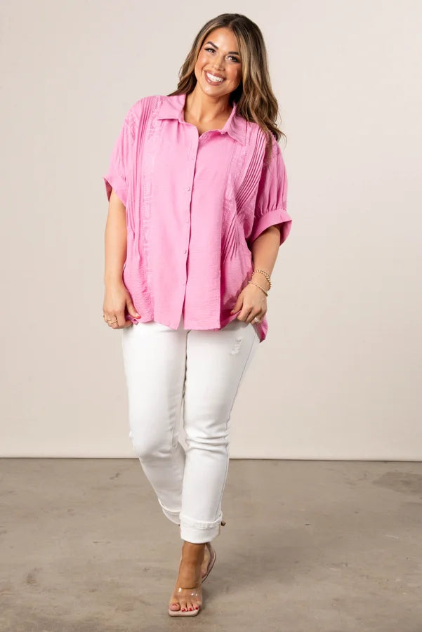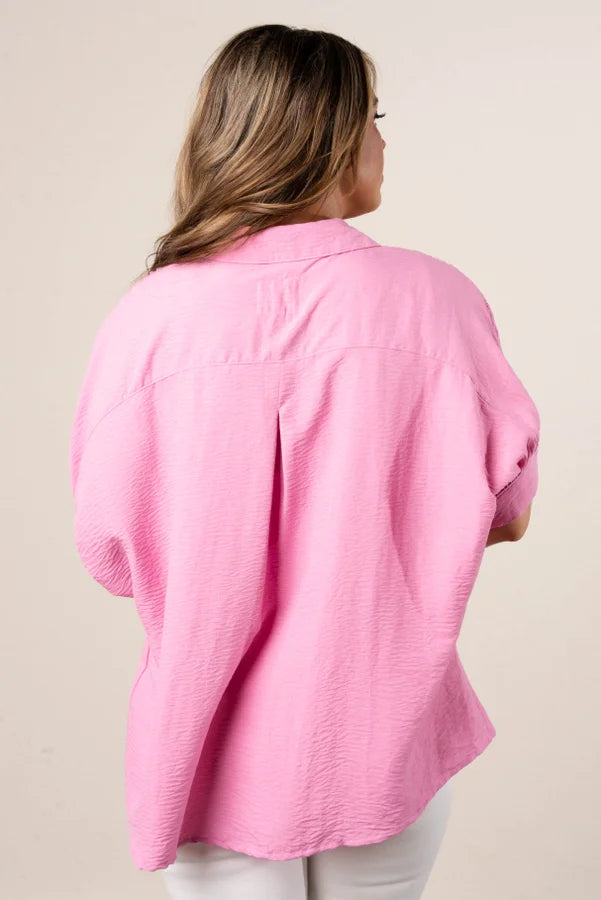 Crinkle Knit Lace Inset Blouse in Pink