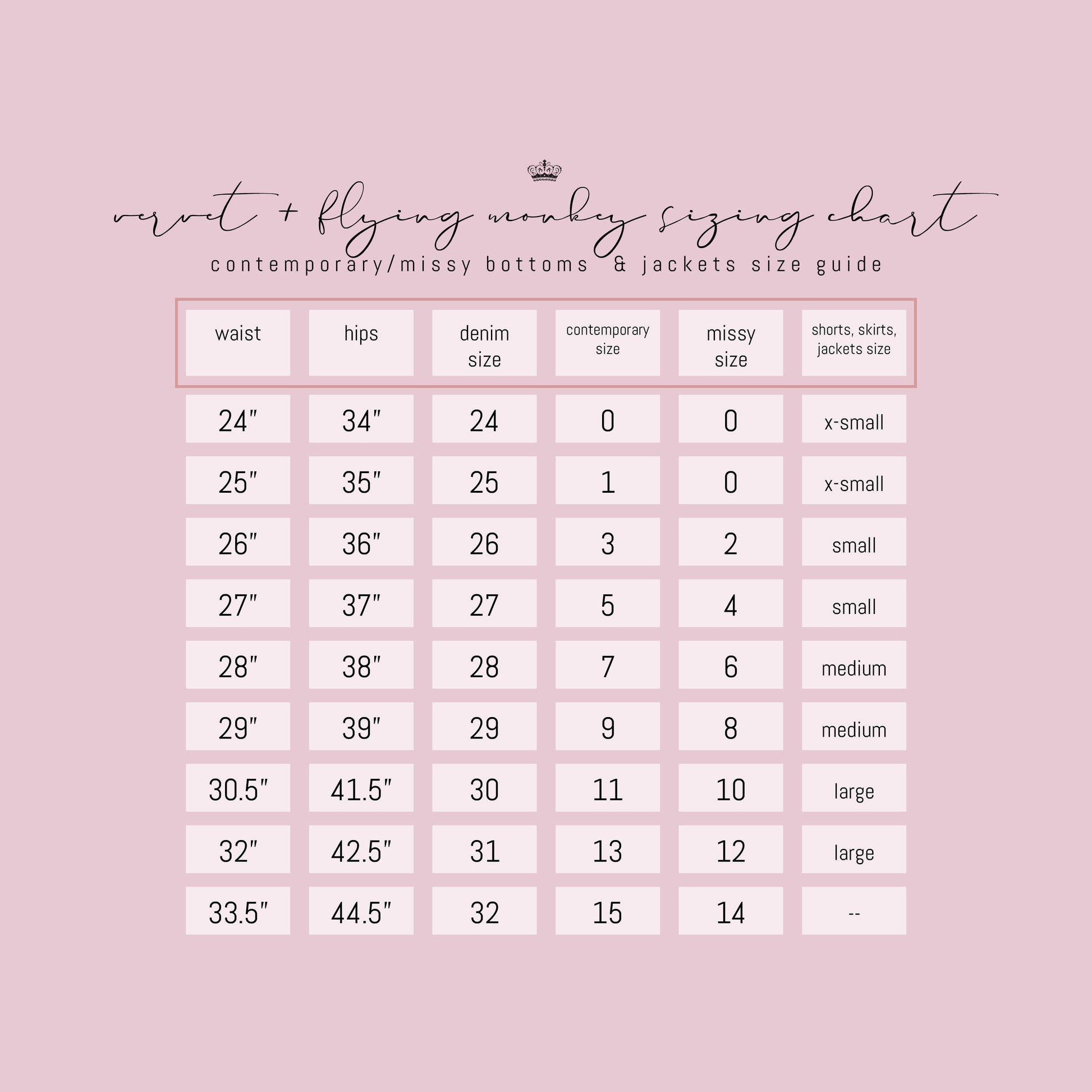 Add 1" for waist and 0.25" for rise per size (approx.)