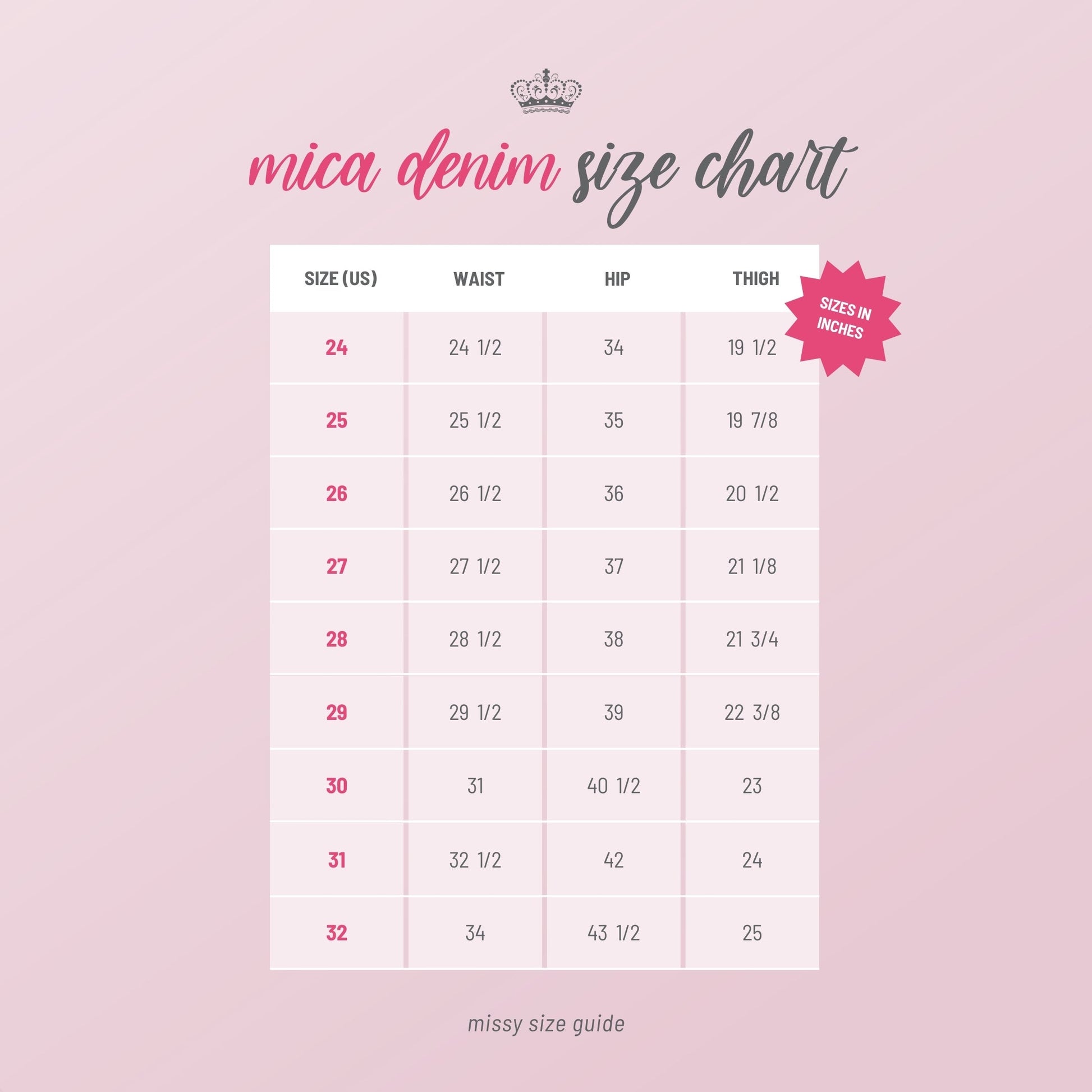 Add 1" for waist and 0.25" for rise per size (approx.)