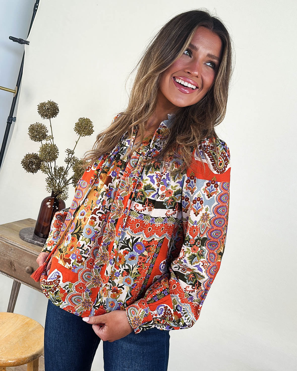 Mosaic Bloom Floral Patchwork Tassel Tie Blouse