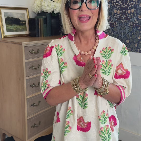The Painted Petal Floral Frill Neck Top is a cheerful statement piece that brings color and charm to your everyday wardrobe. Designed with a textured ivory fabric and vibrant abstract floral print, this blouse instantly brightens any outfit.