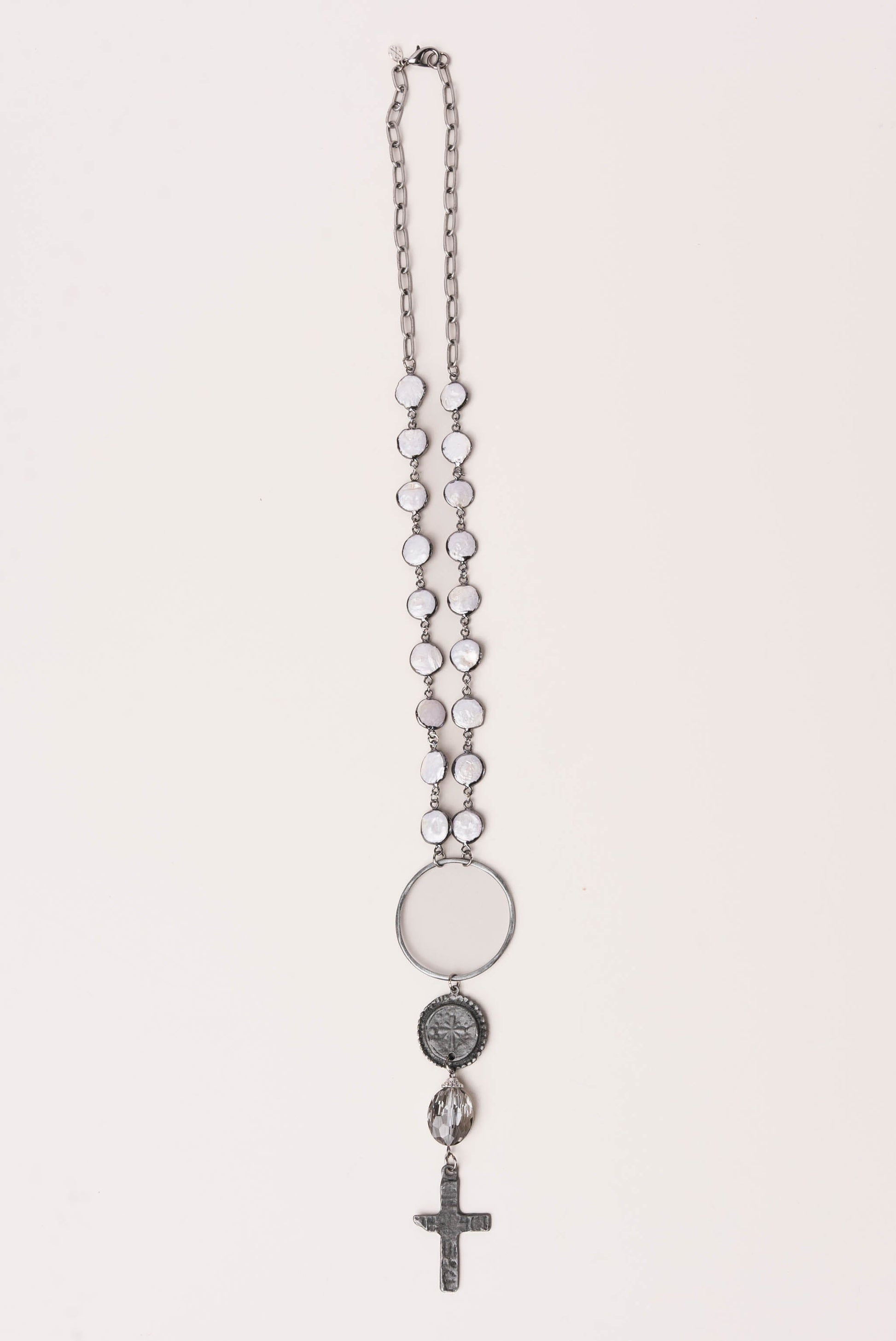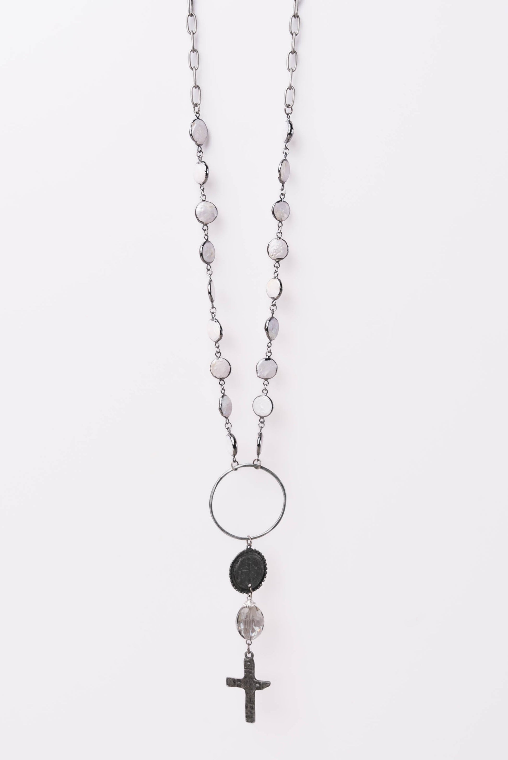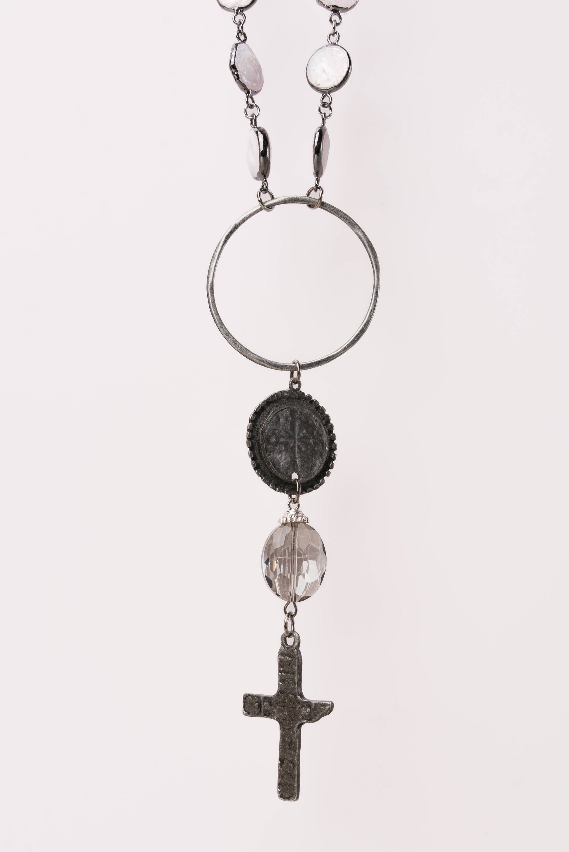 Pearl Chain Cross + Coin Pendant Necklace