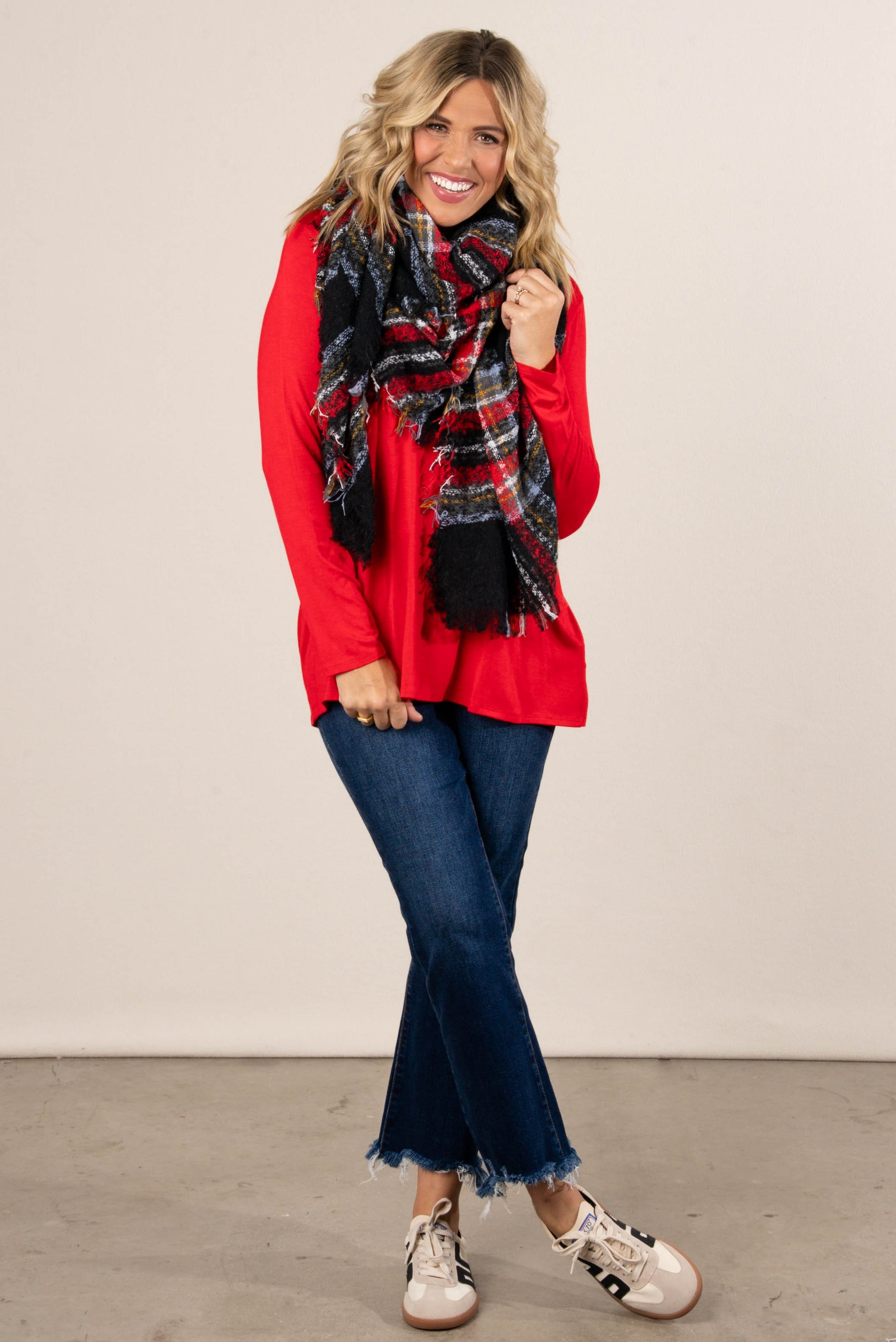 - Design: Classic plaid blanket scarf with soft fringe detailing