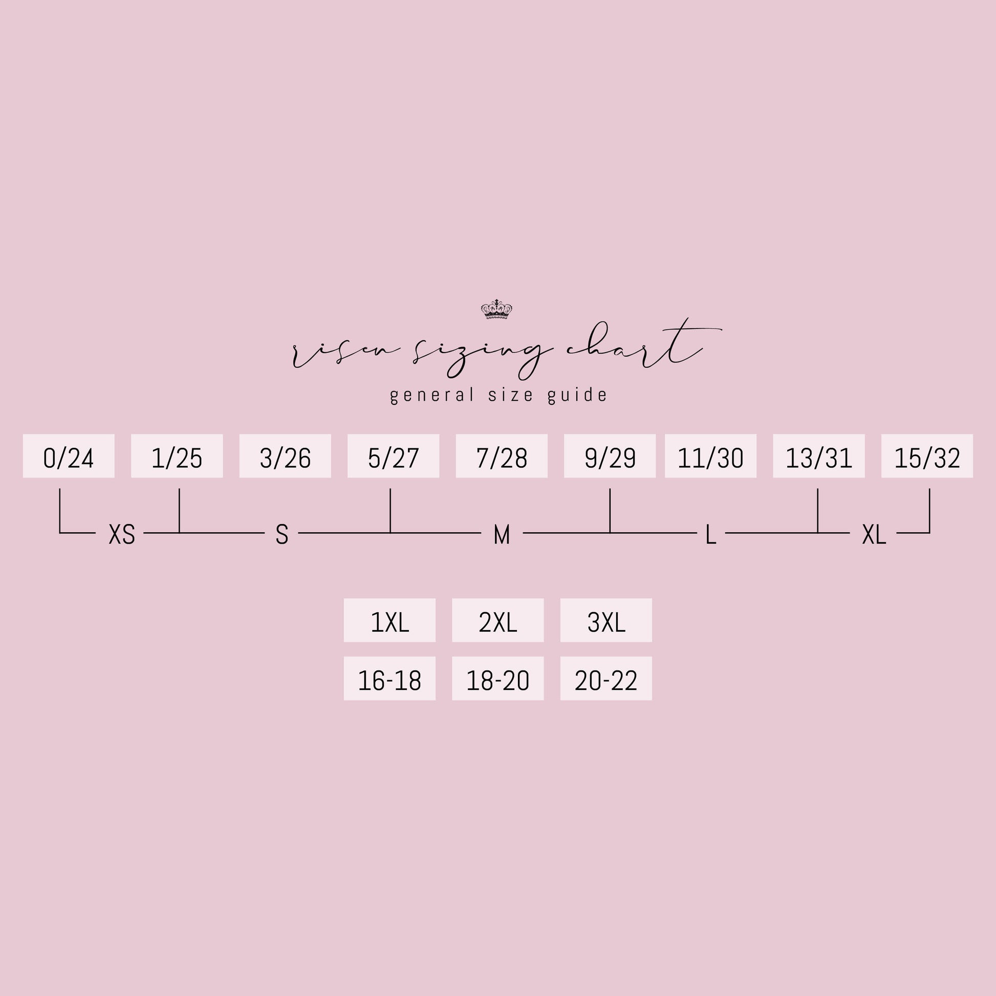 Add 1" for waist and 0.25" for rise per size (approx.)