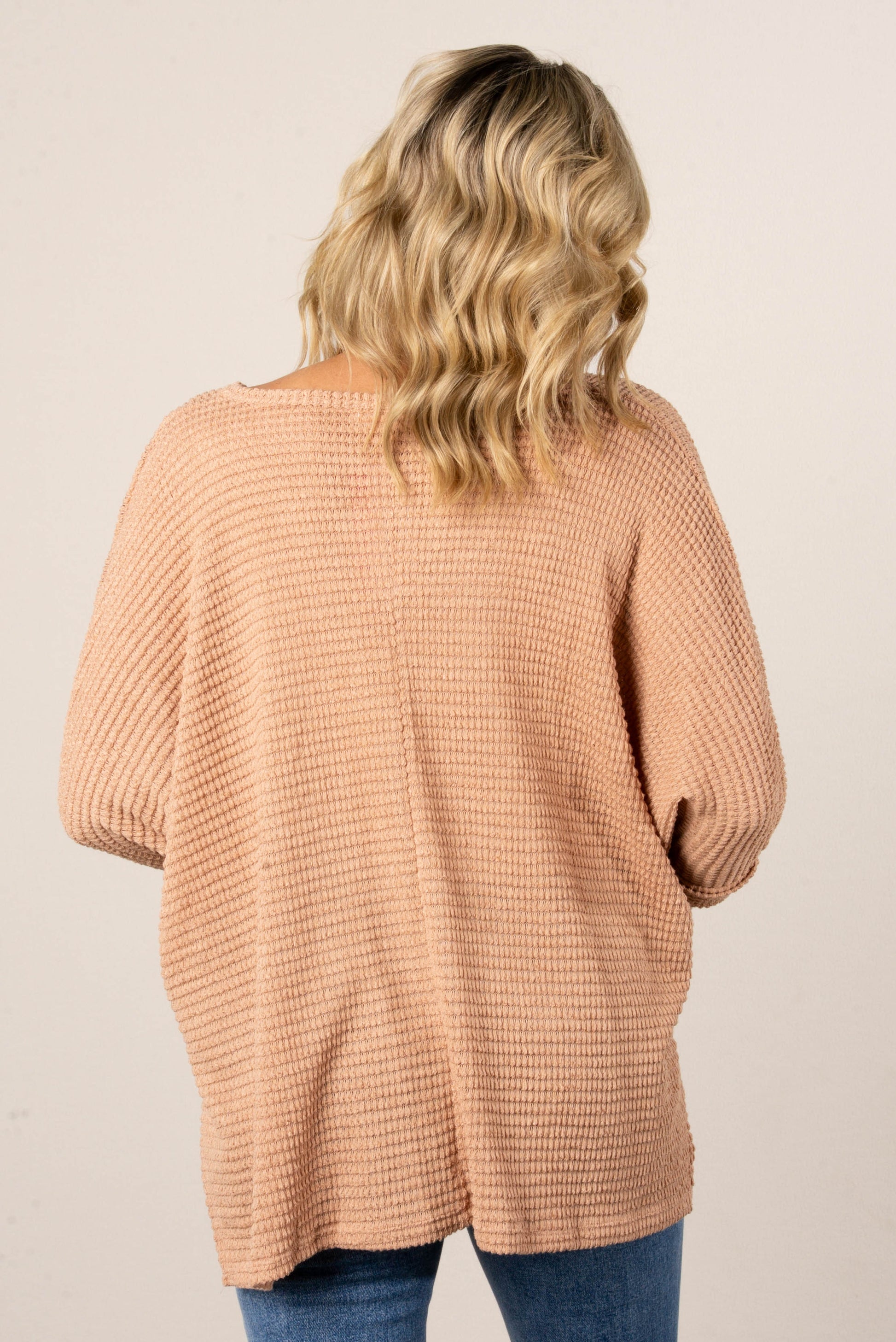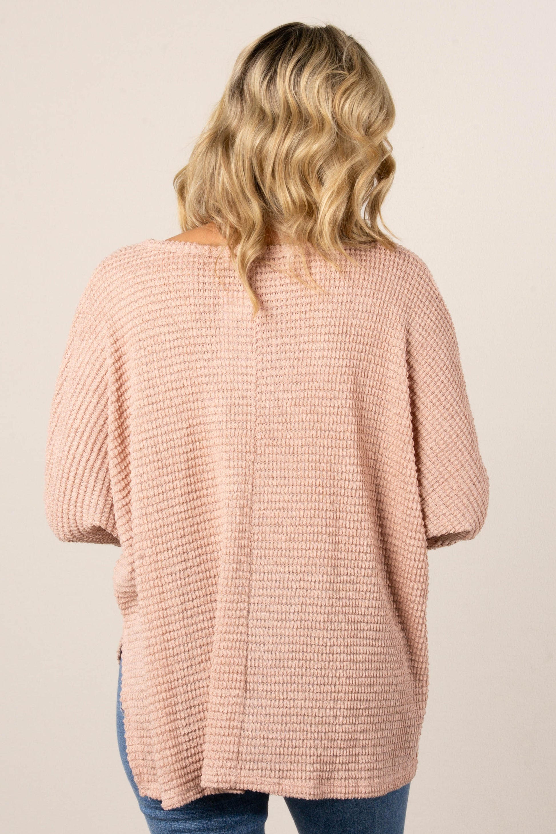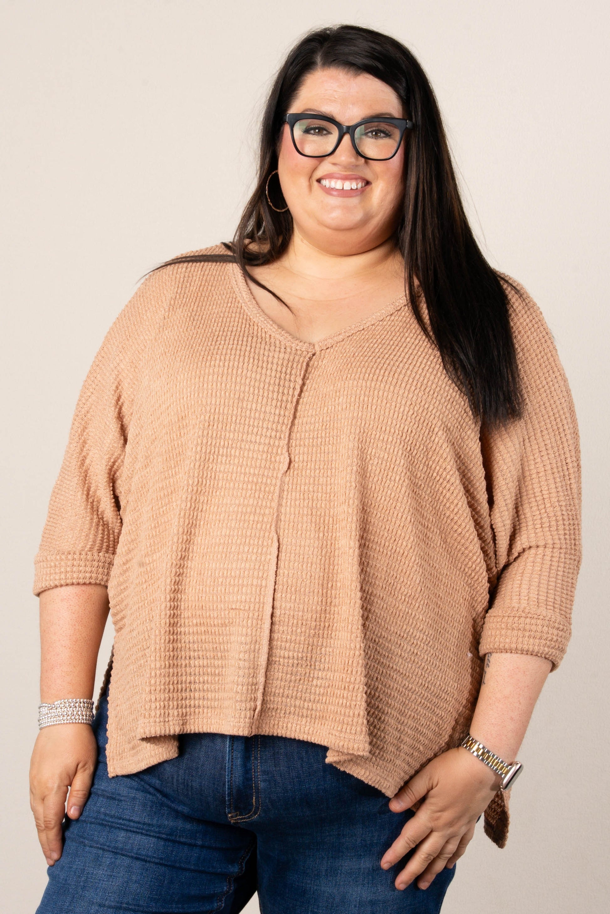 • Style: Relaxed-fit waffle knit V-neck dolman top with drop shoulders, side slits, and a slightly high-low hem for easy layering