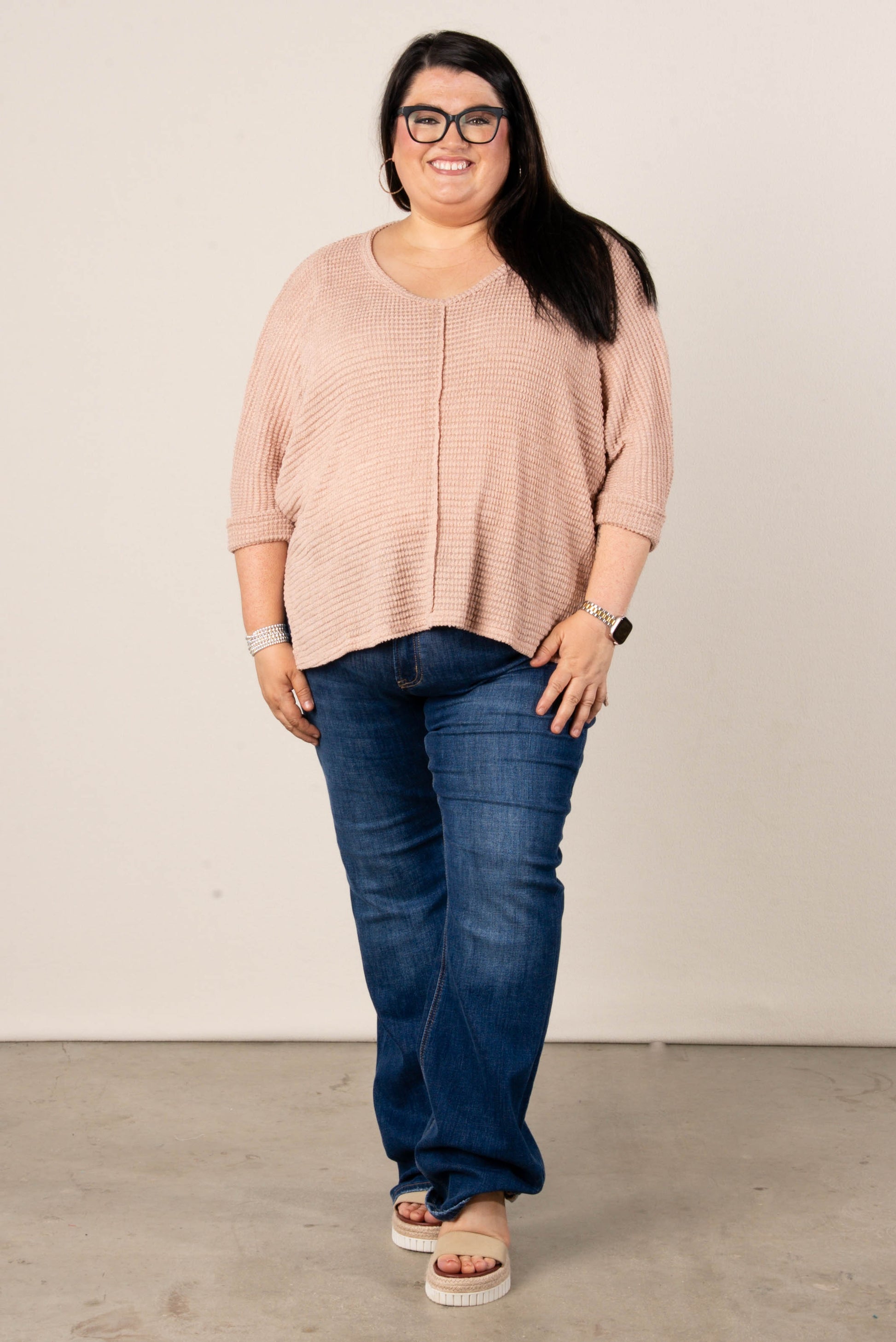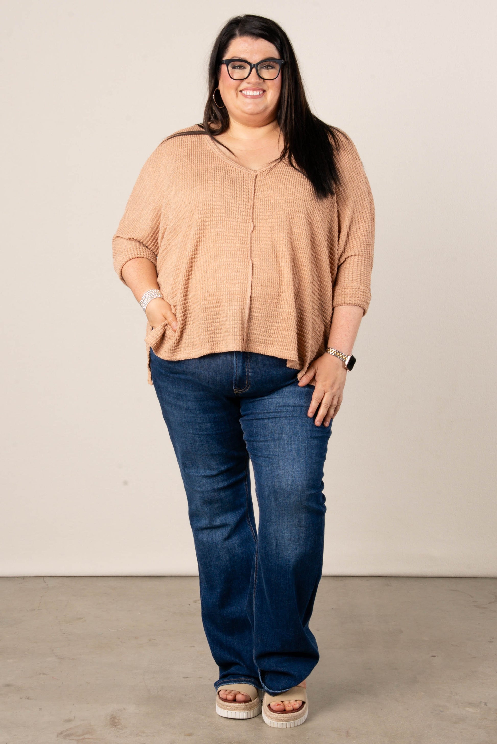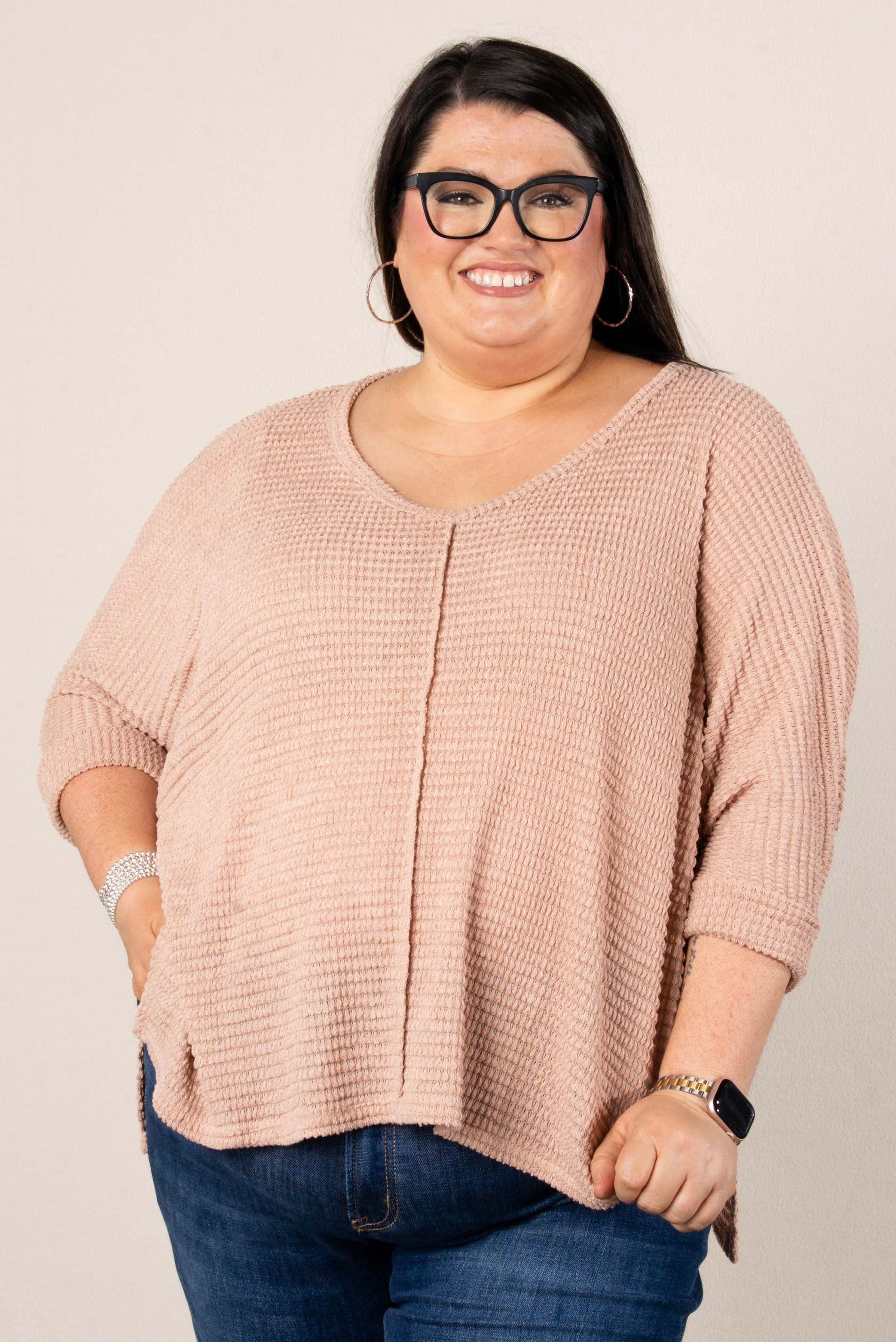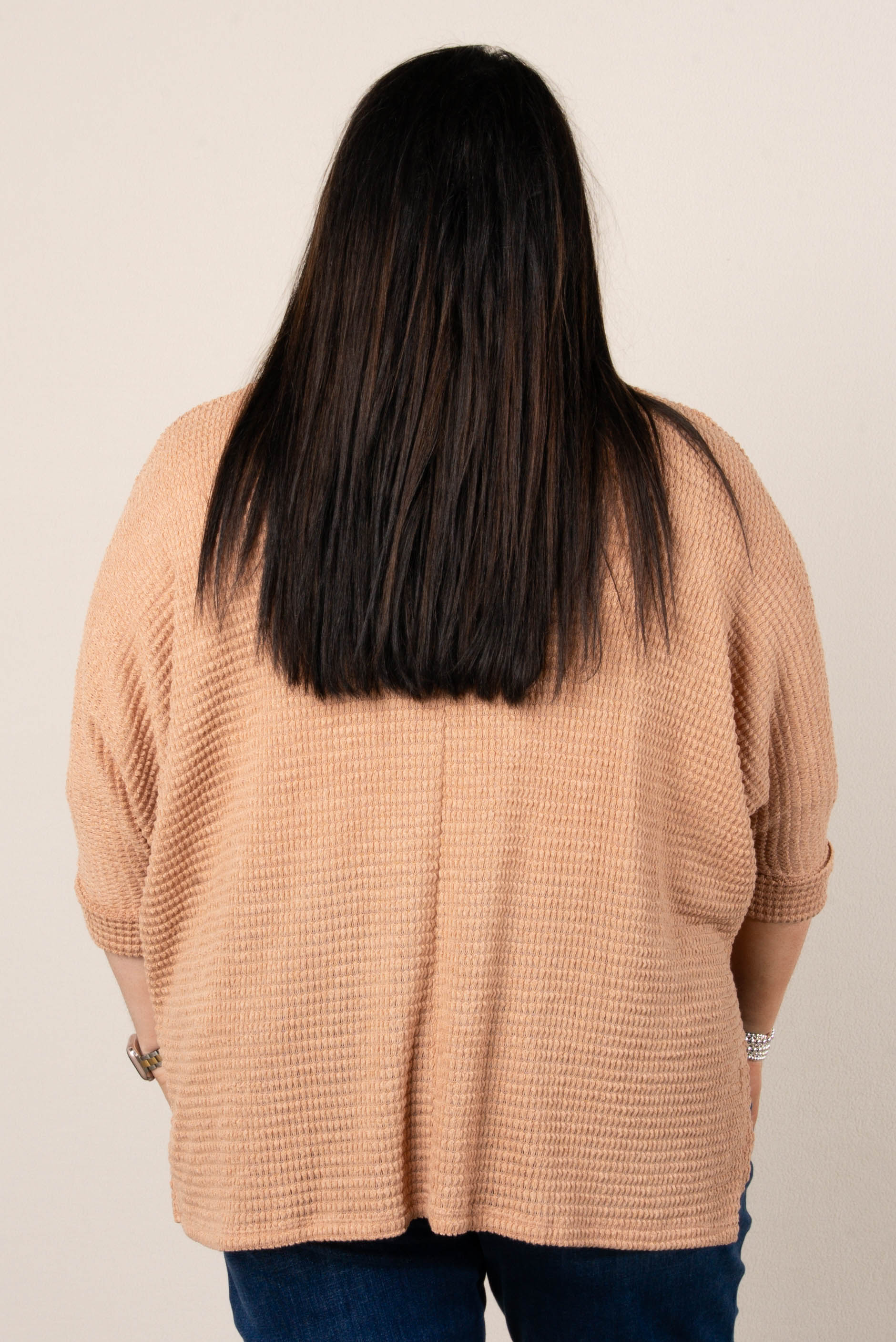 • Style: Relaxed-fit waffle knit V-neck dolman top with drop shoulders, side slits, and a slightly high-low hem for easy layering